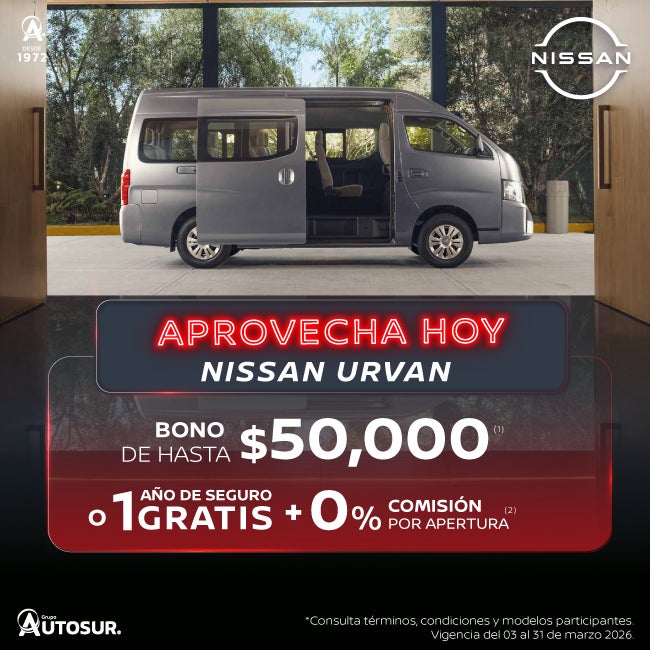 Se aplica para URVAN 11 PASAJEROS AA '25 en operaciones de contado. (2) Aplica para todas las versiones Urvan 2025 en operaciones de contado o en operaciones de crédito celebradas con Credi Nissan. No aplica con otras promociones ni en compra de flotillas. Para conocer planes y modalidades de crédito, verificar precios, requisitos de contratación, comisiones, disponibilidad, términos y condiciones, consulta a tu Distribuidor Autorizado Nissan. Vigencia del 03 al 31 de marzo 2026.